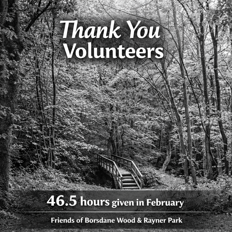 We’re delighted to share that volunteers gave a total of 46.5 hours of their time during February to help care for Borsdane Wood and Rayner Park.