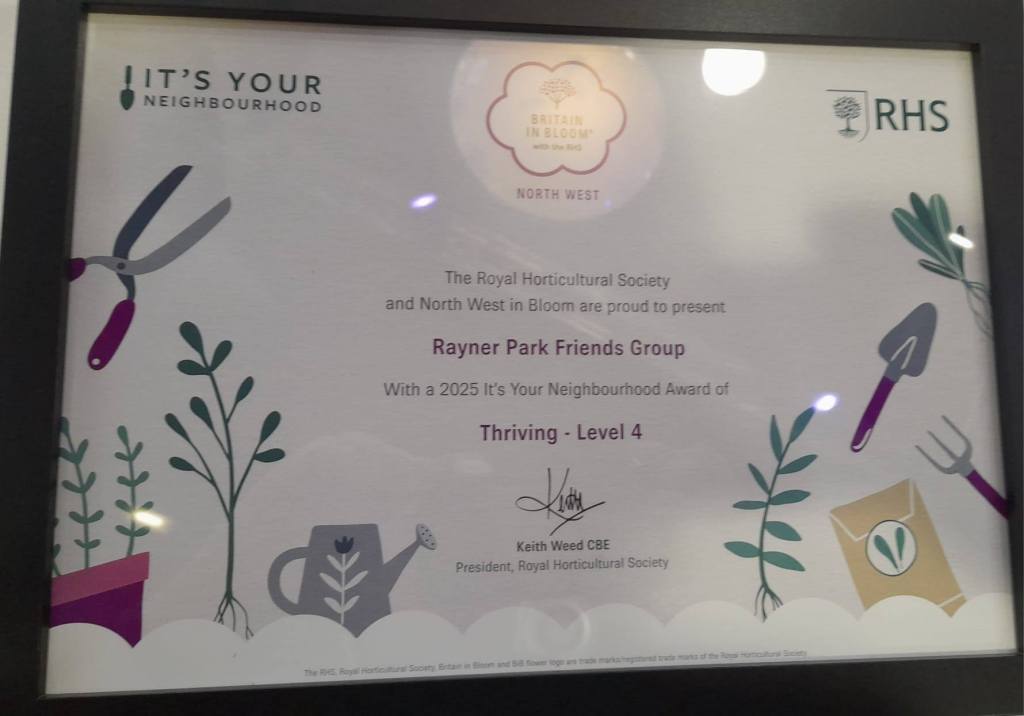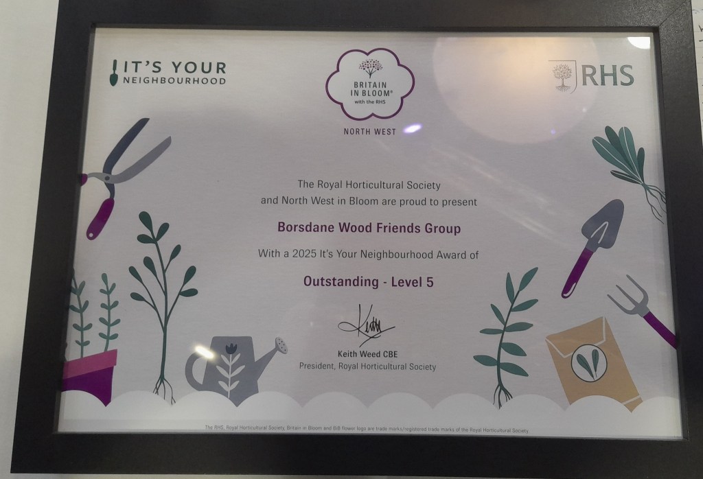 In the 2025 Britain in Bloom North West Awards we were awarded a Level 5 – Outstanding, for our work in Borsdane Wood (for the 6th year running), and a Level 4 – Thriving award, for our work in Rayner Park (for the 4th year running). Great recognition of our volunteers for organising community events and looking after these precious green spaces. Thank you!