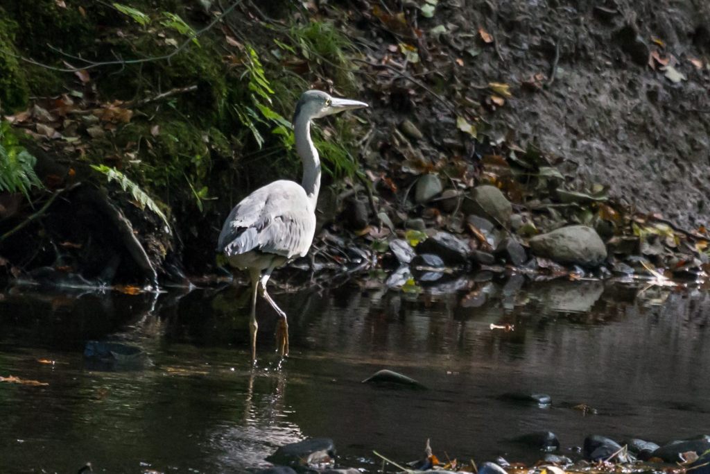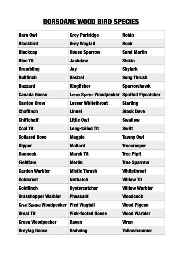 Amongst the recorded bird life there are treecreeper, nuthatch, robin, wren, mistle thrush, song thrush, blackbird, great spotted woodpecker, grey wagtail, pied wagtail, chiffchaff, great tit, blue tit, coal tit, long tailed tit, willow tit, siskin, magpie, chaffinch, house sparrow, tree sparrow, whitethroat, rook, collared dove, wood pigeon, kingfisher, willow warbler, woodcock, goldcrest, little owl, raven, buzzard, and sparrowhawk.