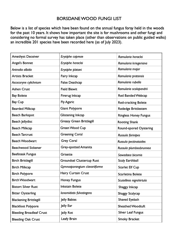 Borsdane Wood is composed of native tree species such as oak, ash, alder, elder, wych elm, silver birch, downy birch, beech, lime, willow, rowan, cherry, hazel, hawthorn, blackthorn, sycamore (not native), hornbeam and dog rose, and is also home to a wide variety of fungi.